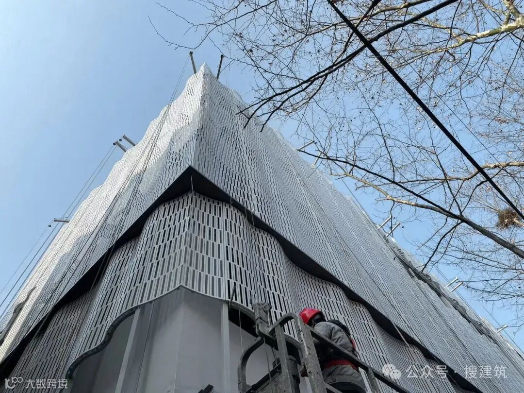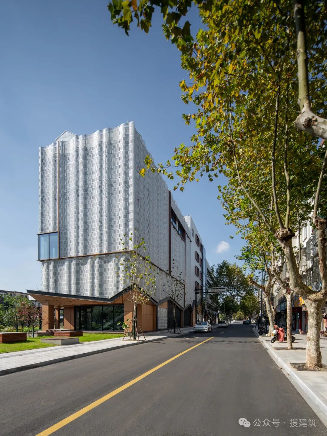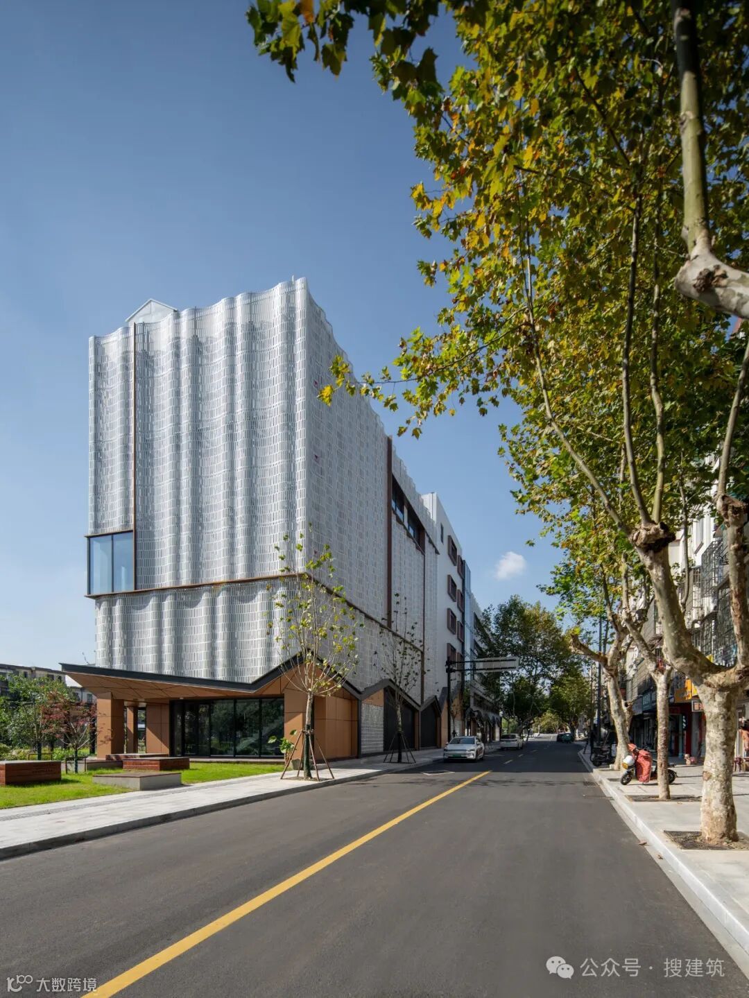 新建筑立面遵循“新旧对话,修旧如旧”的设计理念,以尊重历史风貌为基础,巧妙融入现代美学。设计团队对非遗元素进行了现代化的艺术诠释,选用弧形仿古纹路的穿孔铝板作为主要立面材料,将原建筑的面砖立面进行完全拆除后覆盖,为其注入全新的生命力。
