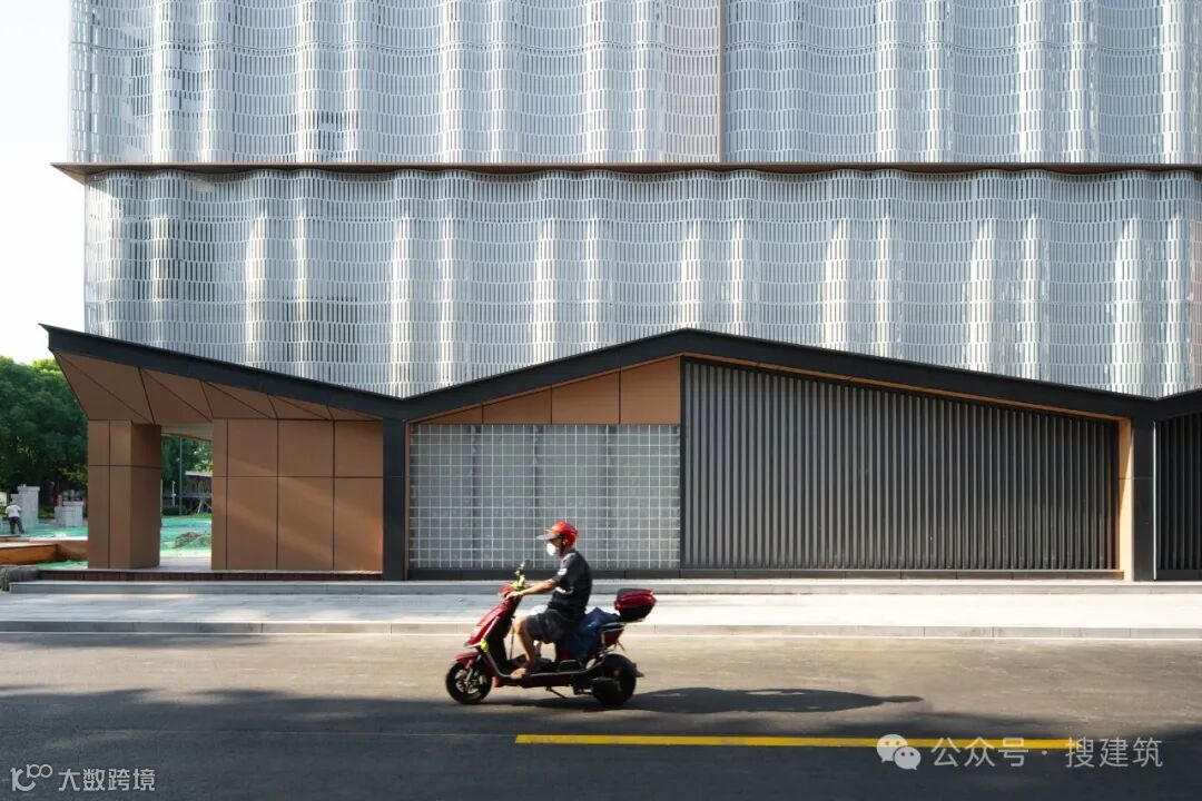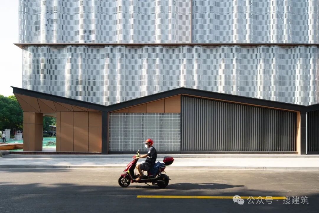 项目内设的海盐非物质文化遗产馆(以下简称“非遗馆”)已开启试运营。其立面更新采用波纹穿孔铝板,通过水平线条与垂直构件的交错构图,新旧相宜,又充满现代气息。