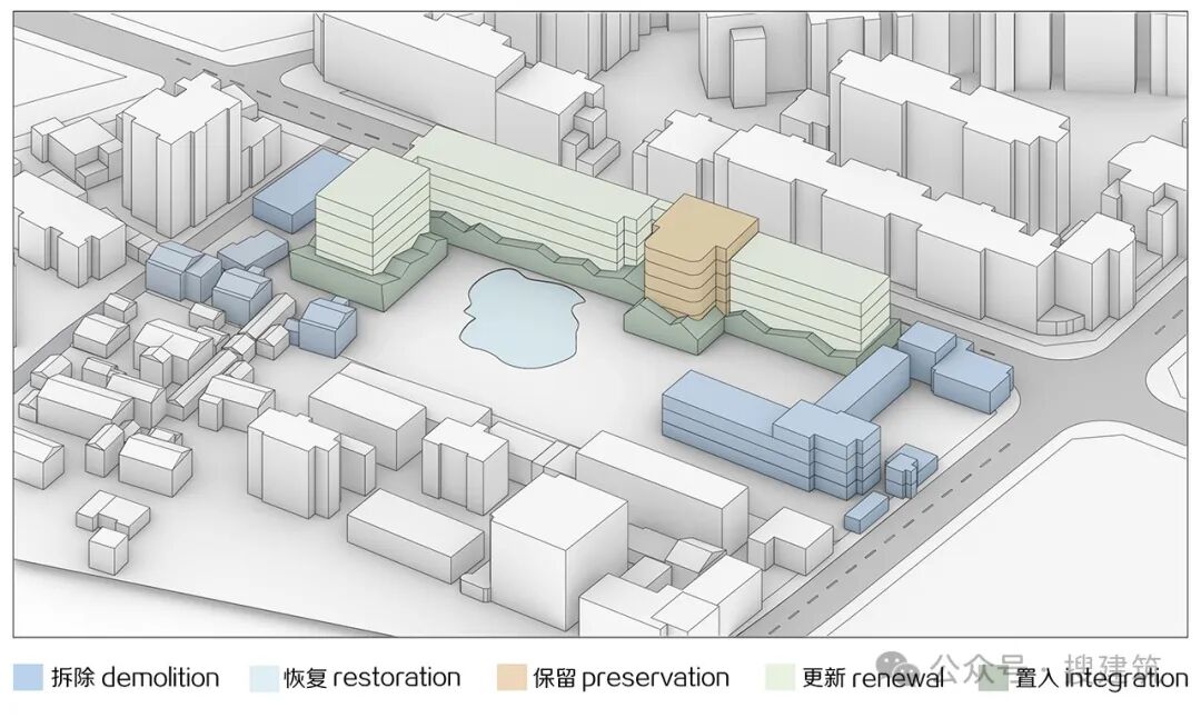 场地内北楼和南楼两栋主要建筑均为框架结构,长期使用导致建筑外观与内部设施老化严重,设计方案对其进行立面更新。其中,北楼中段的电力仪表厂入口立面保存相对良好,建筑风格为上世纪末的流行风格,颇具历史感,设计方案对其屋顶和立面进行修复,保留工业记忆,与新建筑立面之间创造历史对话。