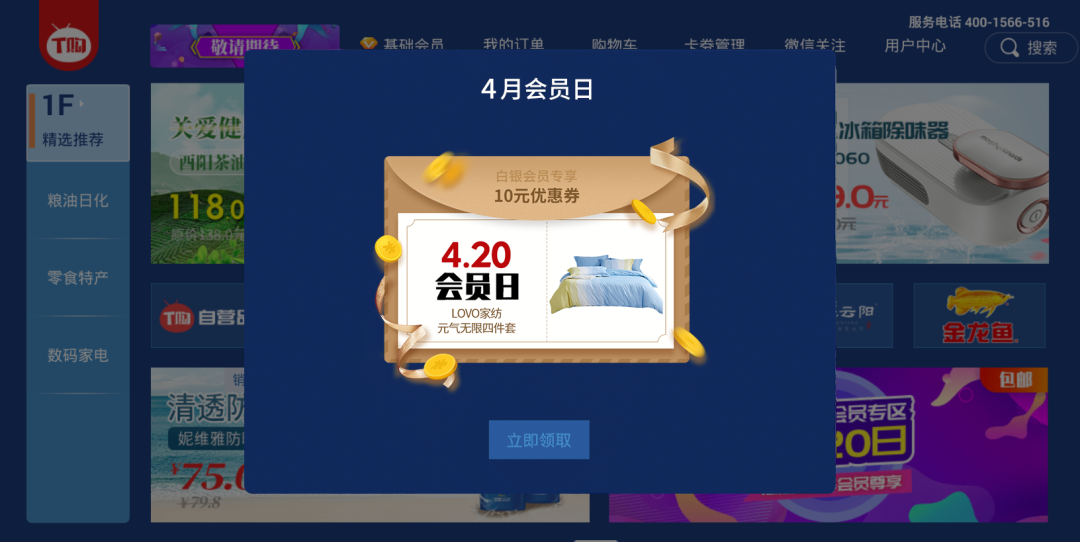 在TGO商城首页领取会员专属优惠券(不同会员等级将弹出相应面额的优惠券,仅限4月20日会员日当天领取及使用)