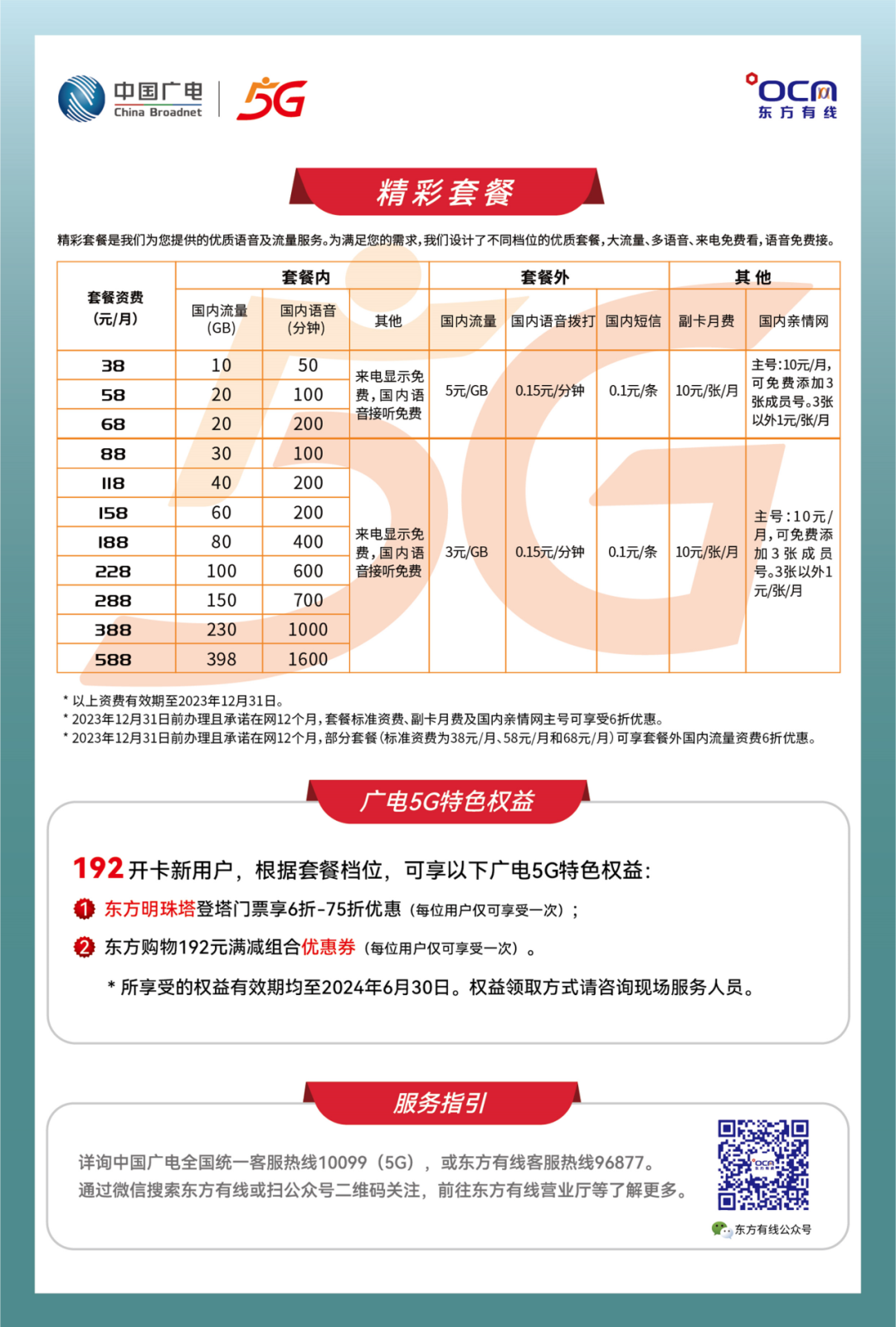 东方有线现已推出中国广电5G业务。黄金频段信号覆盖广,192开头全新号段海量靓号先到先得。优质套餐多种组合,大流量、多通话。现有套餐资费折扣限时优惠、多充多赠、赠送流量语音等优惠活动。上述套餐资费有效期由2023年6月30日延至2023年12月31日,套餐及叠加促销活动的内容不变。