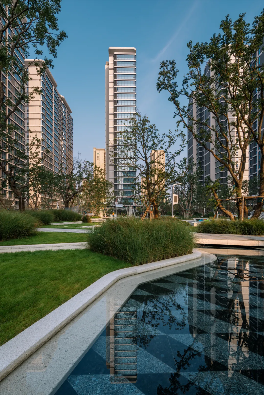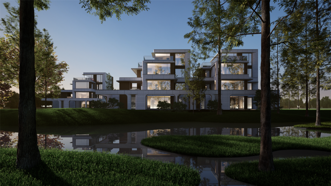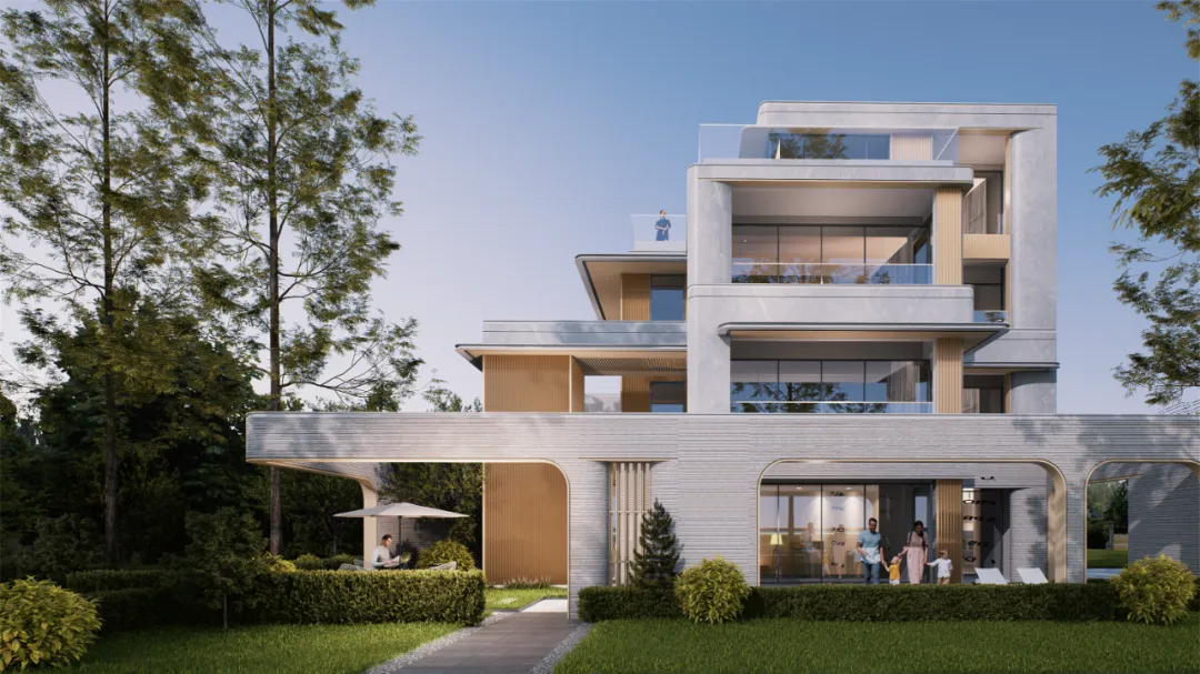 居住区以现代简约风格为基调,沿用弧形元素,通过米白色仿石材质感材料和暖香槟色,营造出一种温馨而不失高贵的氛围。使得建筑在不同光线下展现出丰富的层次感。