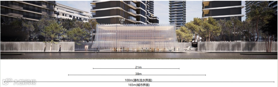 约百米水瀑界面,延城市界面创造约百米流水墙,潺潺流水引导住户进入园区,使归家动线沉浸在林瀑之间,洗涤城市外界的纷扰。