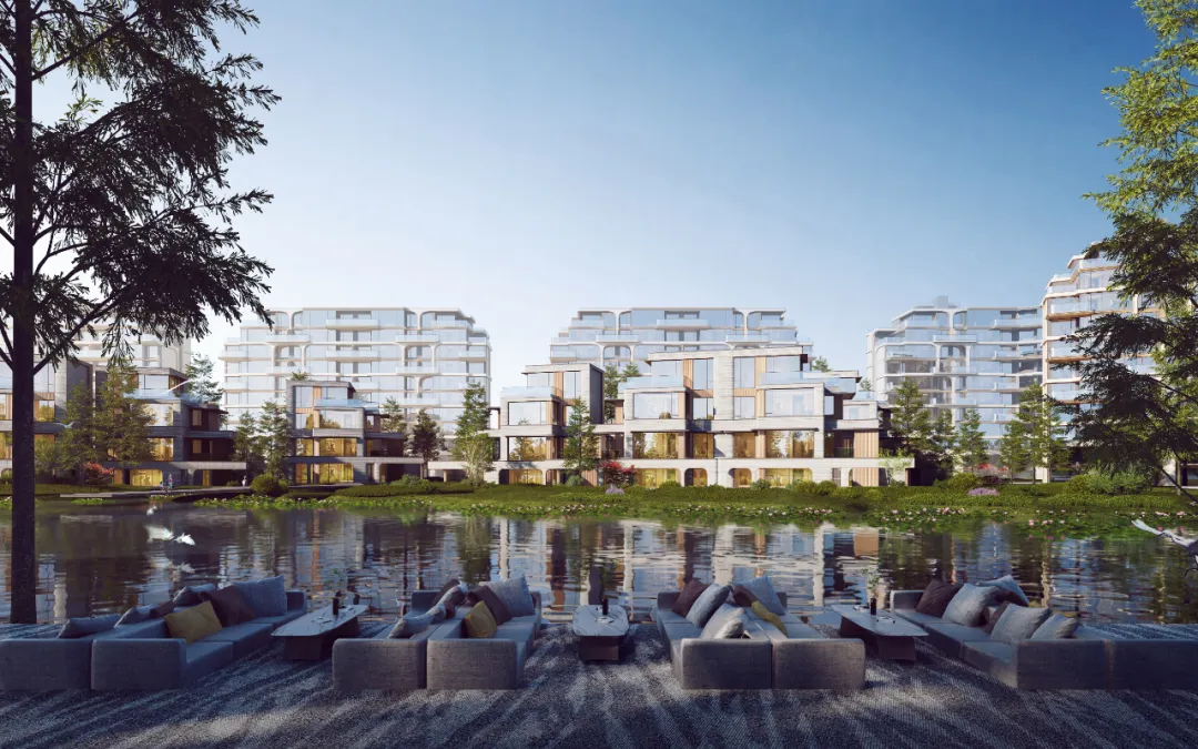 项目依循地势高差,引水入园,规划群岛式布局,盛揽“三川、一湖、四岛”,划界时代岛居;岛居19栋,超尺度楼距排布,无界视野,以每一栋皆临湖的极致奢享,创造比肩全球度假酒店的居住体验。