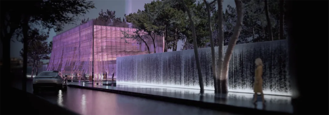 金瀑玉门外部构面通过千余块夹胶玻璃瓦片,转译叠瀑流动的瞬间,通过新材料的运用,刻画凝固的时间;玻璃面层经过特殊处理,使其每一块都能柔和的折射太阳的光影;晶莹剔透的光斑洒落地面,形成玲珑剔透的金玉效果。