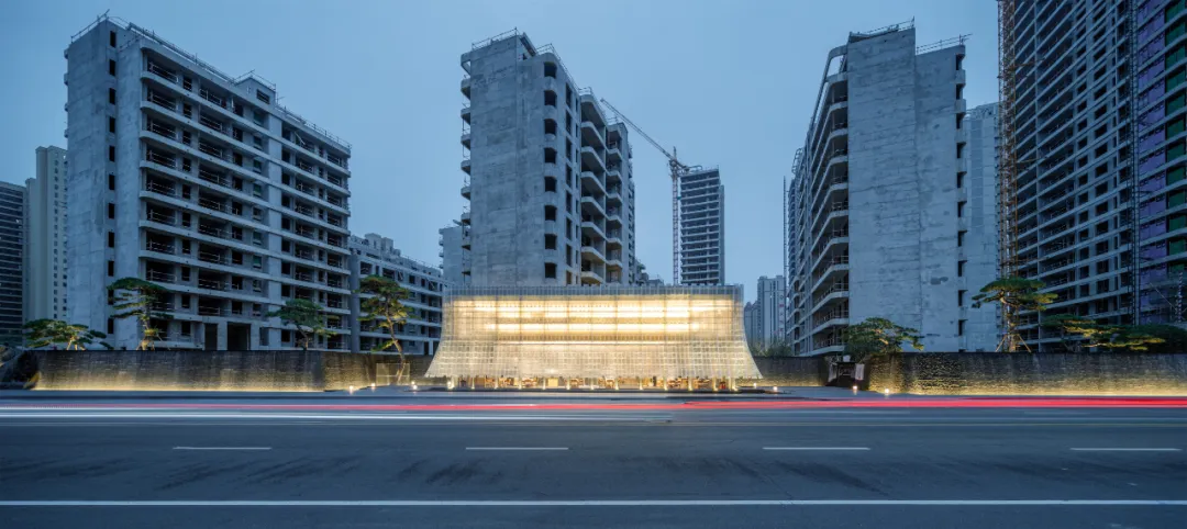 玉门内部,内藏精致木构,通过艺术形体重构一个木构建筑,营造出一个内有乾坤的空间体验。大堂包括长桌等候区、大堂服务区,灯光从木构缝隙中渗透出来,中心区域设置通高灯箱,加强大堂的仪式体验。