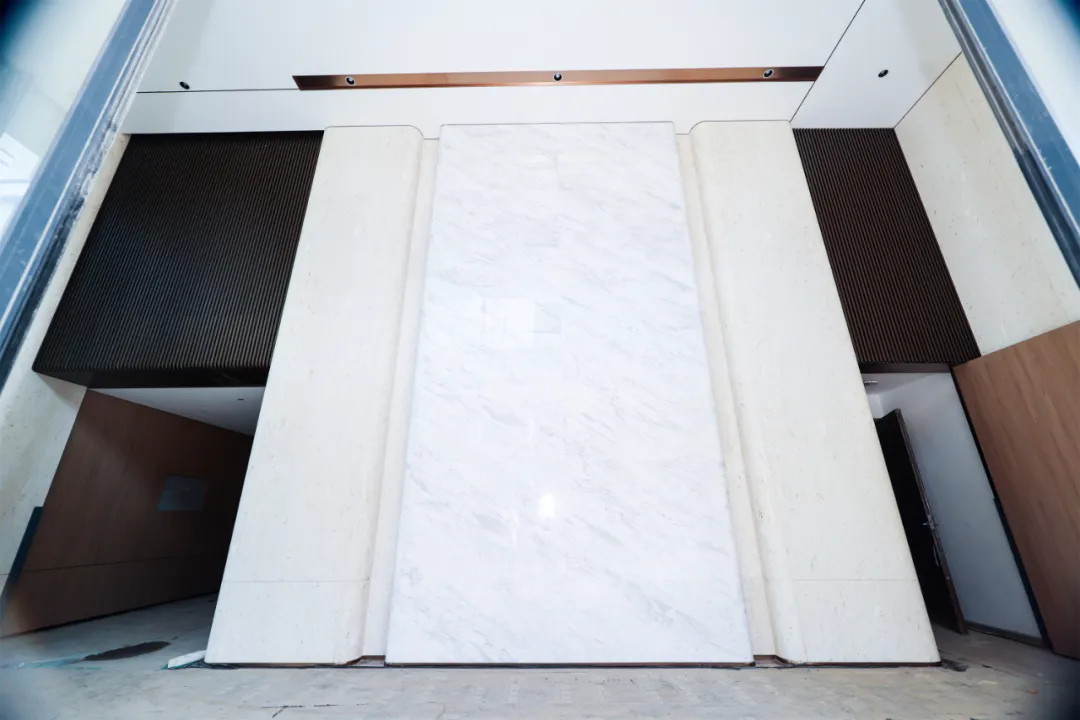 车库坡道顶面点点星光灵感取自劳斯莱斯豪车星空顶设计,并以此基础上增加了山脉与云朵造型。坡道两侧由贝金米黄天然石材包裹,更显奢华与尊贵。