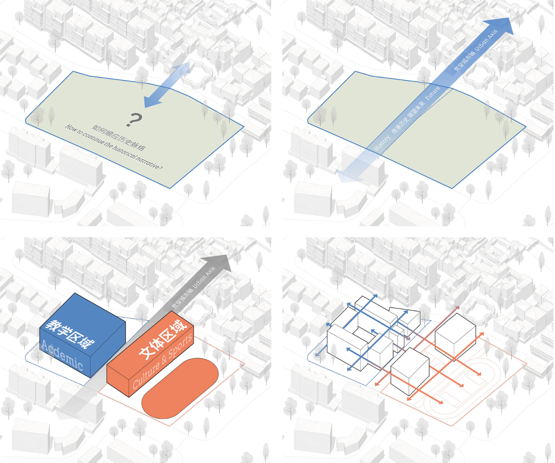 延续祥符直街肌理的中轴成为校园的公共通廊。其西侧为日常教学区,教室与办公空间环绕于方形内院布置;东侧为文体活动区,包含图书馆、报告厅、食堂、体育馆、操场。