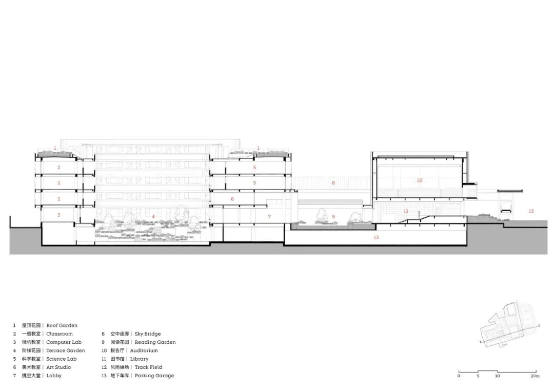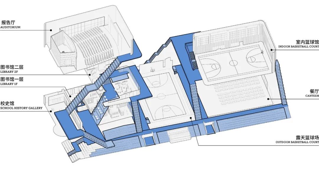 东侧文体活动区内包含了图书馆、报告厅、食堂、体育馆和操场。丰富的功能单元通过立体、环通的流线相互联系,形成一个有机的空间网络。