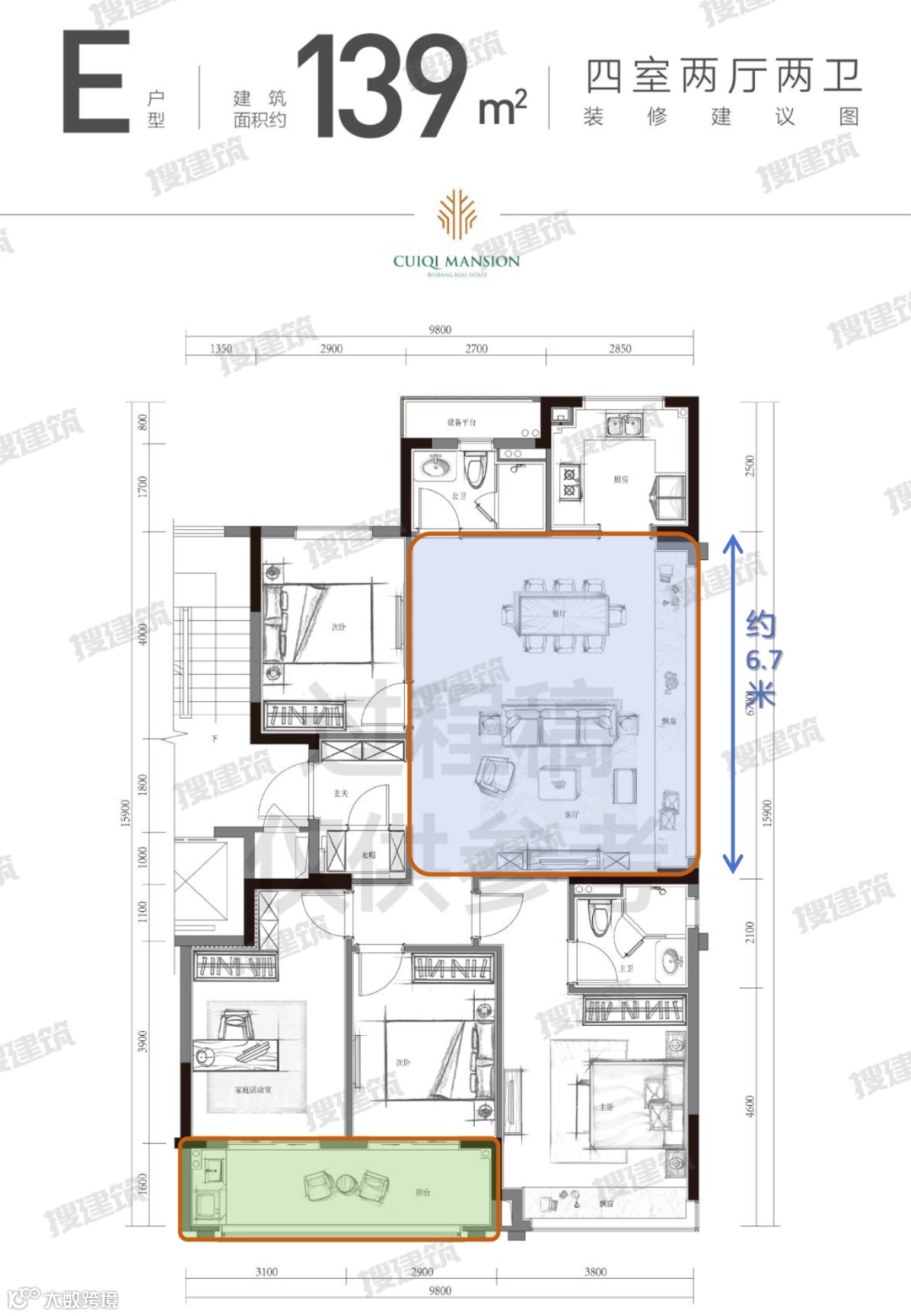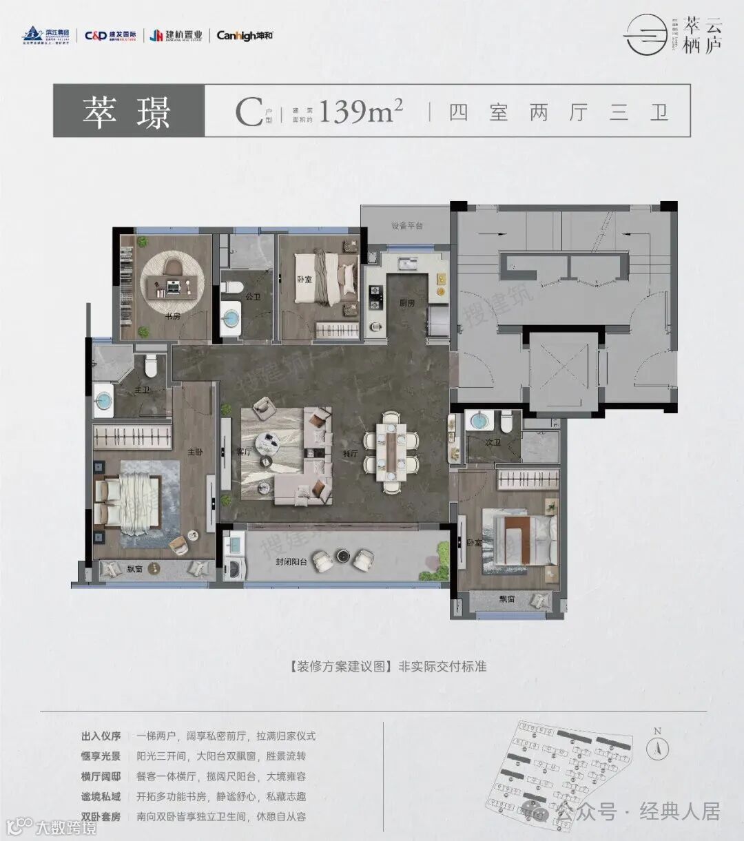 建筑面积约139㎡户型,四房三卫,整个户型三开间南,约13.8米的面宽,带来充沛的阳光。建筑面积约40㎡的一体式横厅,外连约6.8米全封闭阳台,将空间尺度做到了最大可能性的延伸。