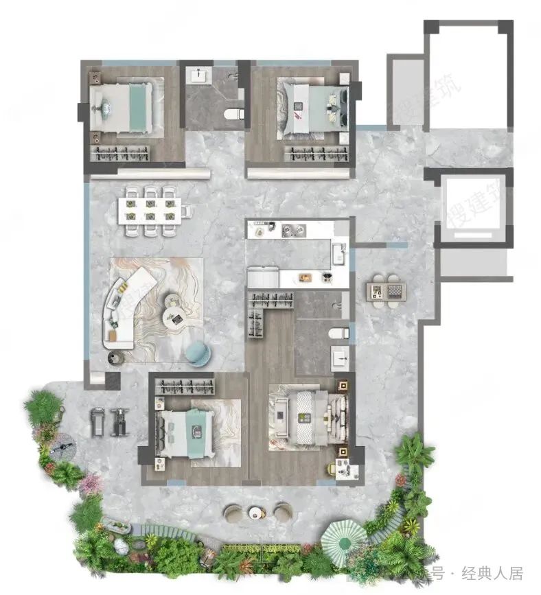 建面约139㎡低密宽境洋房,以合理的空间规划,将四个房间分布于居所四个角落,打造独立静谧、互不干扰的休憩天地,让一家三代人的日常生活所需,皆可在此得到满足。