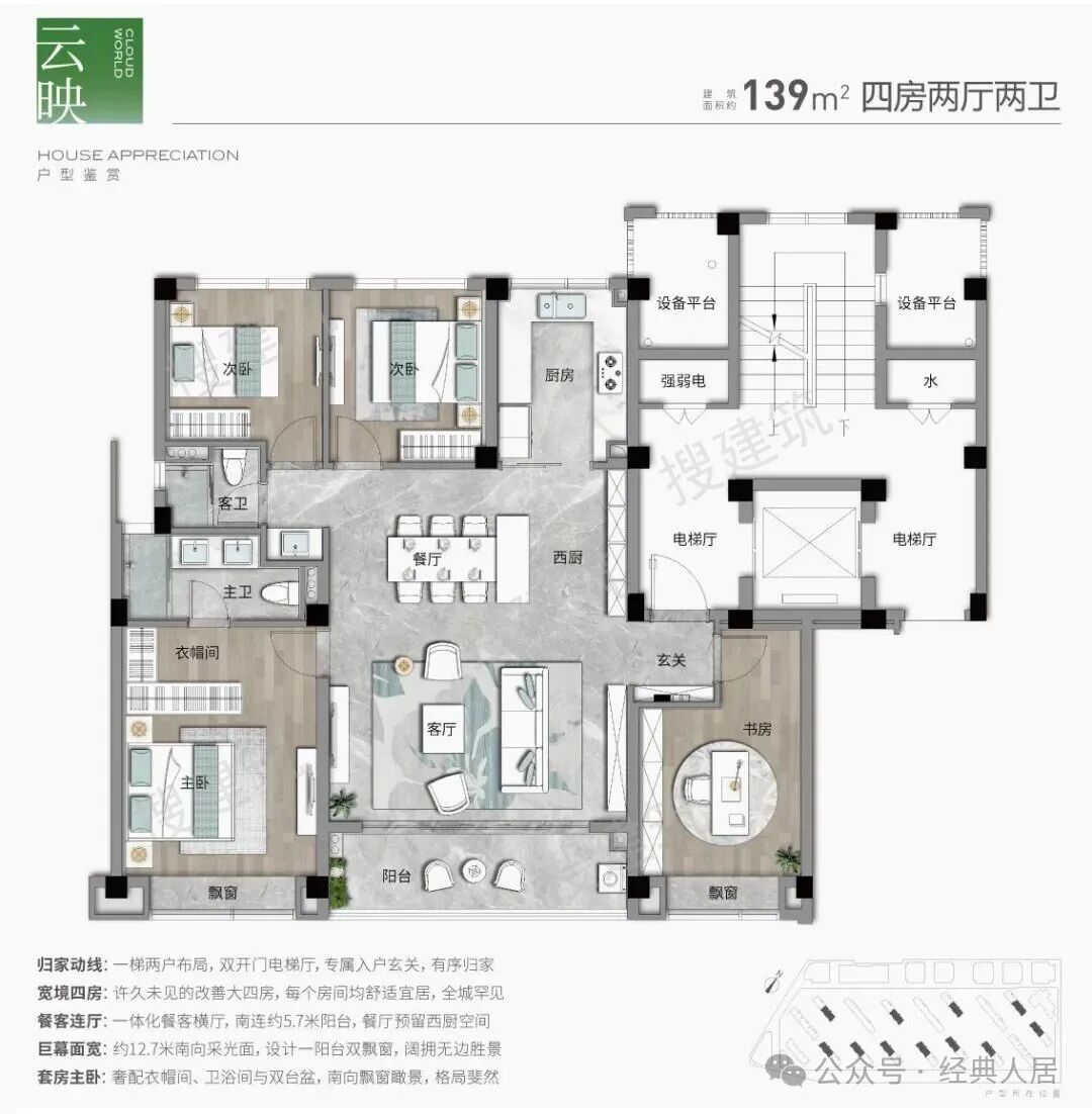 建面约139㎡户型南北通透的四房设计,加一个储藏室,再加一个南向双联阳台,还加一个北向家政阳台,更赠送一个超大电梯前厅,南向的两个卧室均带阳台,这样的空间尺度感,堪比市场160㎡户型。