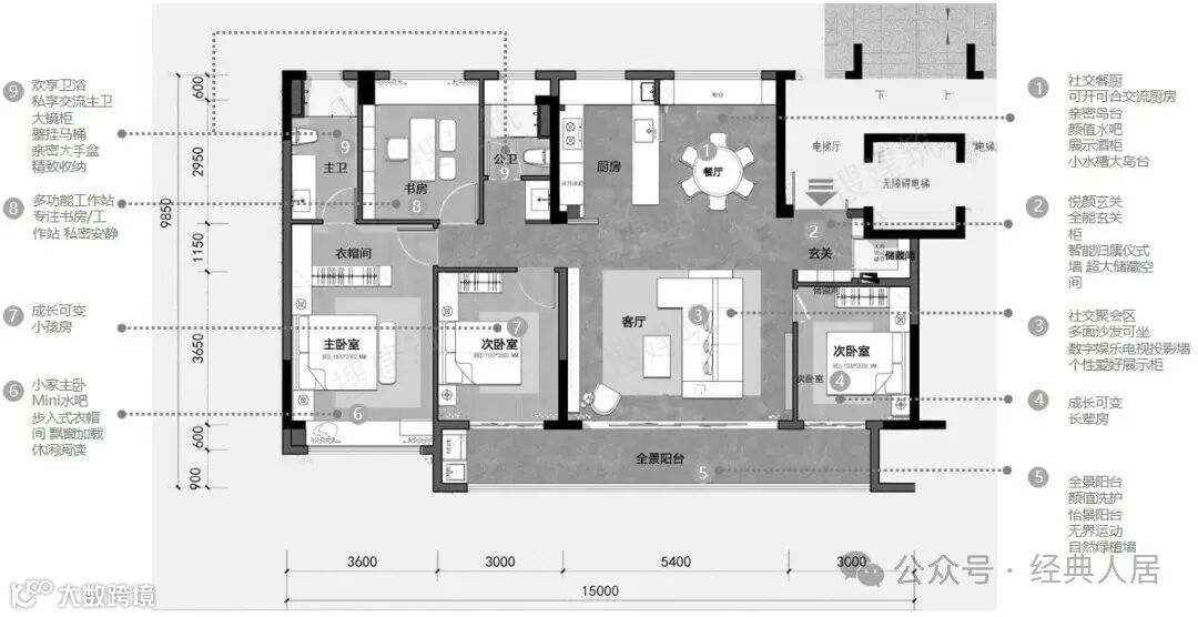 为了把景观面最大化,“两个套房+客厅+次卧”全部朝南一字排开,南向总面宽约13.6米!