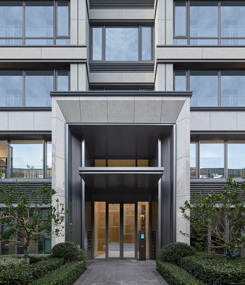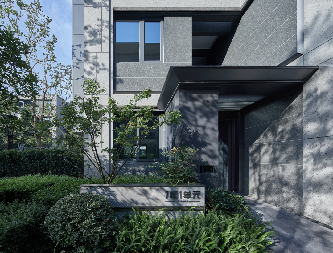 材质细节上,主体墙面采用仿蓝眼睛石材涂料,干净现代,而暖色仿木铝板作为最主要的建筑符号,增加了低密社区家的温度。门头与收边采用深色型材,细节尺寸反复推敲,挺括精致。