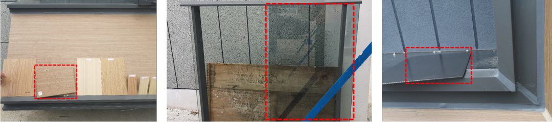 仿木纹铝板,栏杆玻璃、深灰色铝板选样