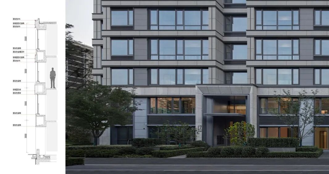 分缝优化:分缝尝试不同方案并通过调节缝宽,塑造不一样的肌理。仿石涂料的大面采用错缝肌理,通过加粗横向线条来强调对位关系。而灰色涂料的缝则采用150间隔6mm宽的竖缝形成仿面砖质感。