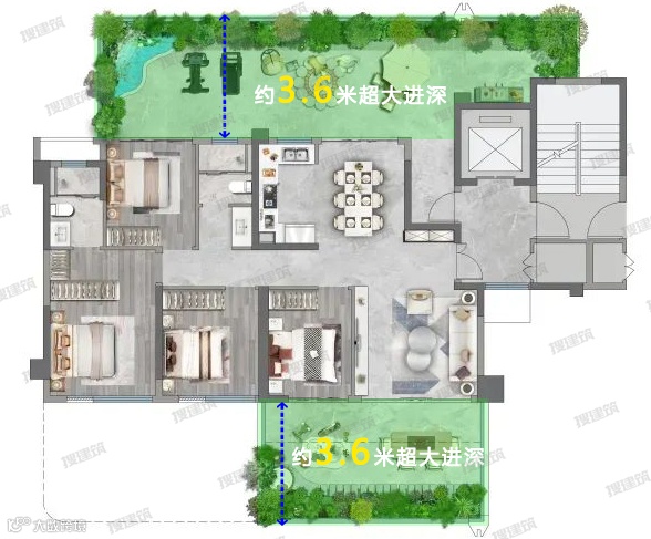 打造出超74㎡南北双花园空间,其中进深超过1.8米部分不计容,约3.6米进深花园
