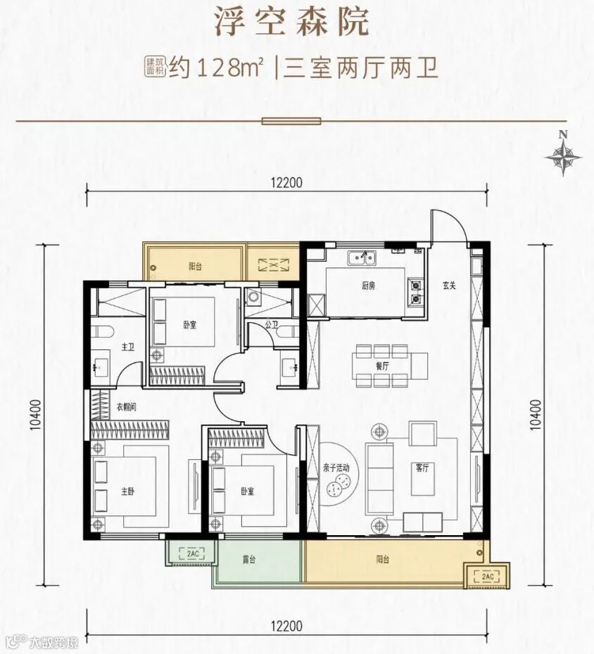 建面约108-143㎡高层和建面约169-189㎡洋房,清一色立体森林公园住宅。我们来看一下建面约128㎡户型: