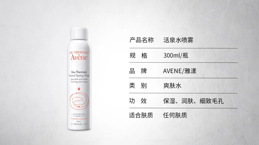 天然泉水,直接从源泉取水,无菌灌装。喷雾后可在肌肤表面形成舒缓、可透气的保护膜,增强肌肤耐受性,降低敏感度,适合任何肤质。
