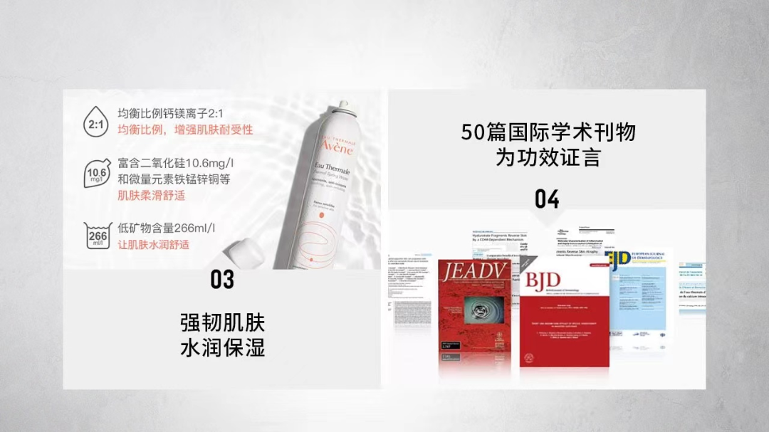 强韧肌肤,水润保湿。钙镁离子均衡比例2:1,增强肌肤耐受性;富含二氧化硅和微量元素,使肌肤倍感柔滑舒适;低矿物含量,让肌肤水润舒适。50篇国际学术刊物,150项基础医学、药理学及临床研究,6300个不同年龄层敏感肌患者实验测试,为高能舒缓功效证言。