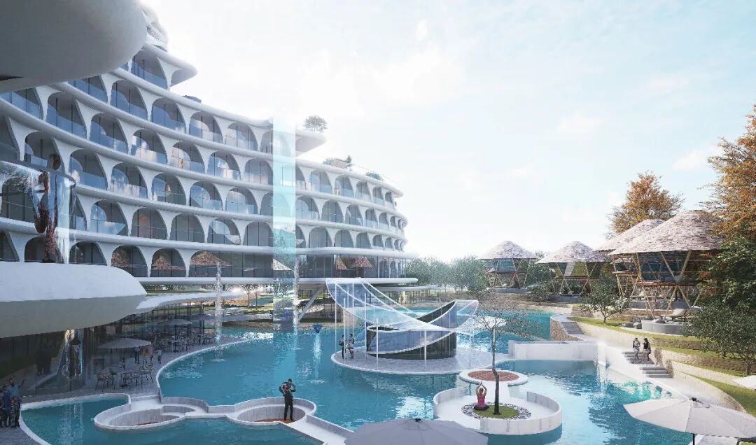 建筑造型则提取了“雀翎”元素,结合客房阳台的层叠交错,将具象的自然韵律与抽象的舞蹈韵律融合,展现出曲线交织的形体之美。