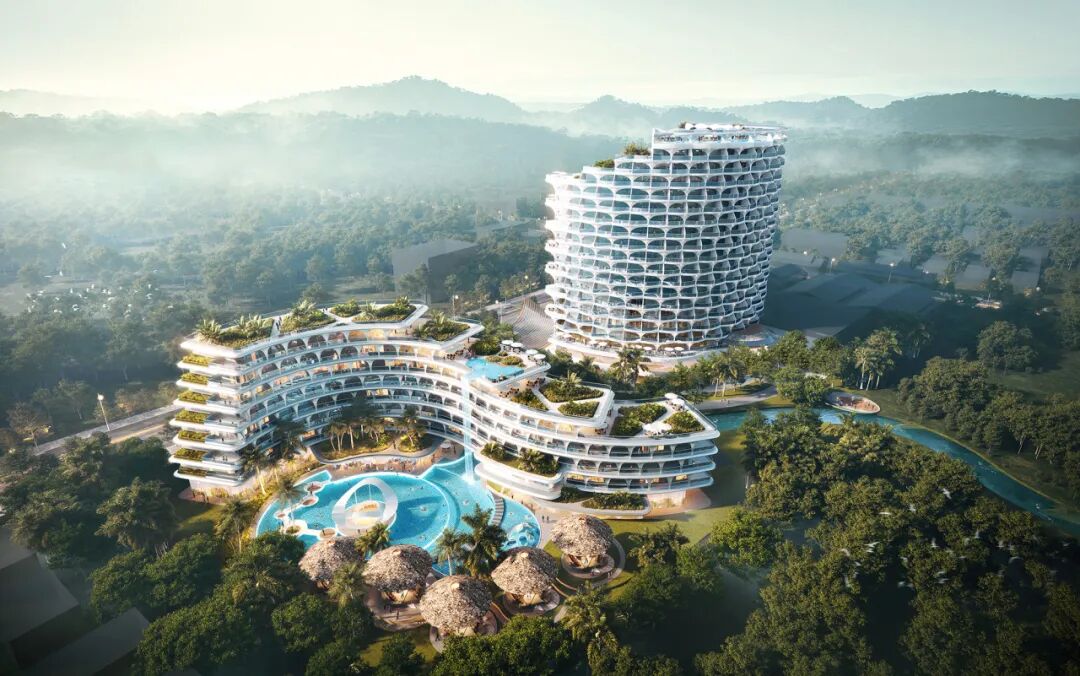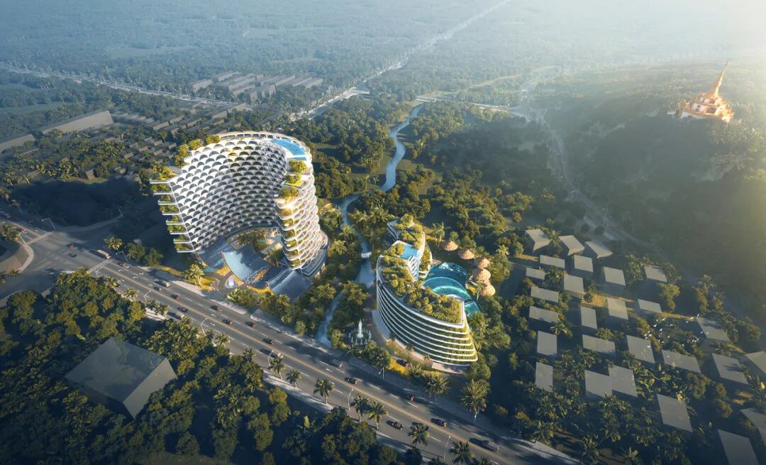 孔雀是傣族的崇拜物,象征着吉祥、幸福、美丽与善良,其独特的气质早已成为芒市的标志性形象。设计灵感源于这一圣鸟,将其气质之美与建筑完美融合,同时融入孔雀舞的精髓、历史传说的神秘感以及细腻高雅的造型艺术,打造独具特征的度假产品。