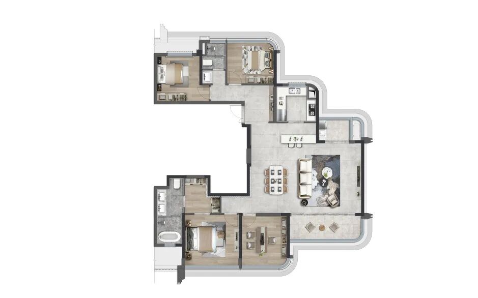 此户型南北通透,通过超大转角景观阳台等设计,创造了一个明亮、宽敞、奢华而又舒适的居住环境,为业主提供了高品质的生活体验。