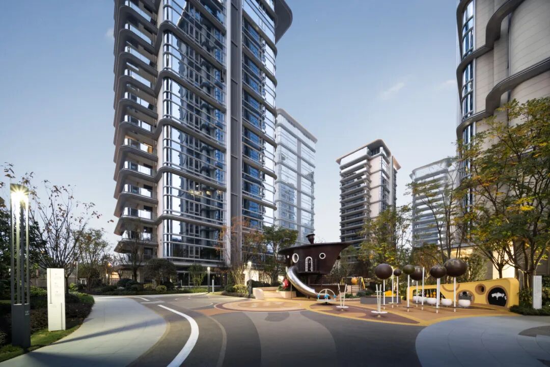 近景为人可触摸区域,大量架空泛空间设计,包括四点半学堂、老年学堂、儿童乐园、活动中心、书吧、休闲区、健身中心、老年康养中心、邻里交流区、棋牌区等。通过架空层内部细节效果与建筑主体建筑干净利落的玻璃碰撞,产生现代、优雅的气质。