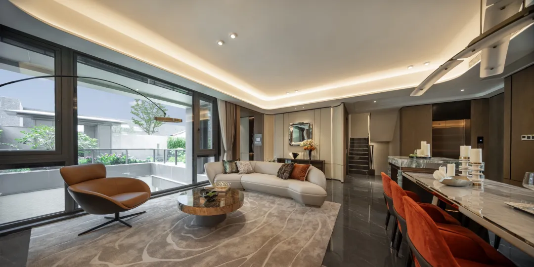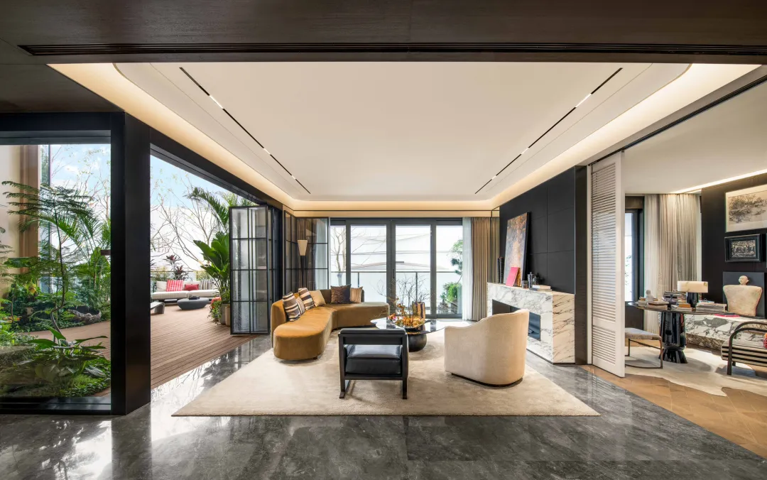层叠水景托举折桥园路,松壑悬亭,石材点缀于水院中,雕琢出层层山峦肌理。室内与景观相互渗透,流光溢彩演绎当代宋韵山水的宁静与浪漫。