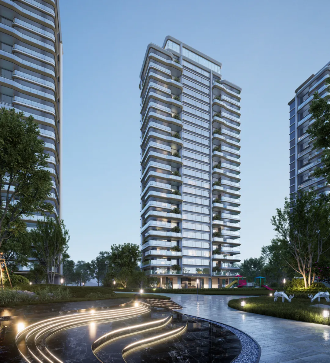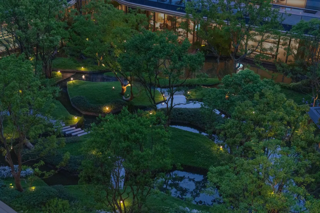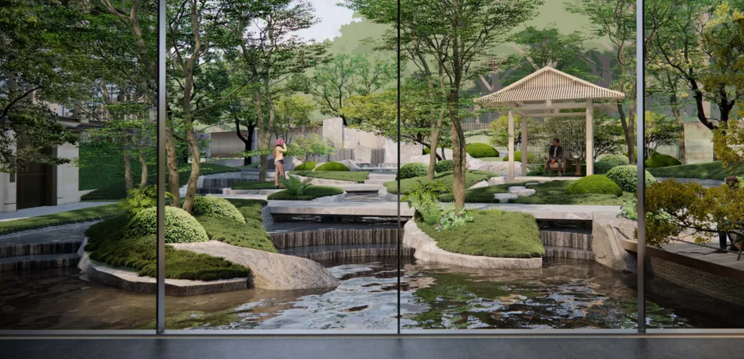 以画境入景,以美学凝韵,汲取南宋书画的山水意境,折叠转译当代立体山水场域。藏匿于山林间的下沉庭院,在繁华中感知宁静,引领着居住者步入一片静谧与清凉。水印叠池,轻踏着林间斑驳的光影,体验沉浸式花园。