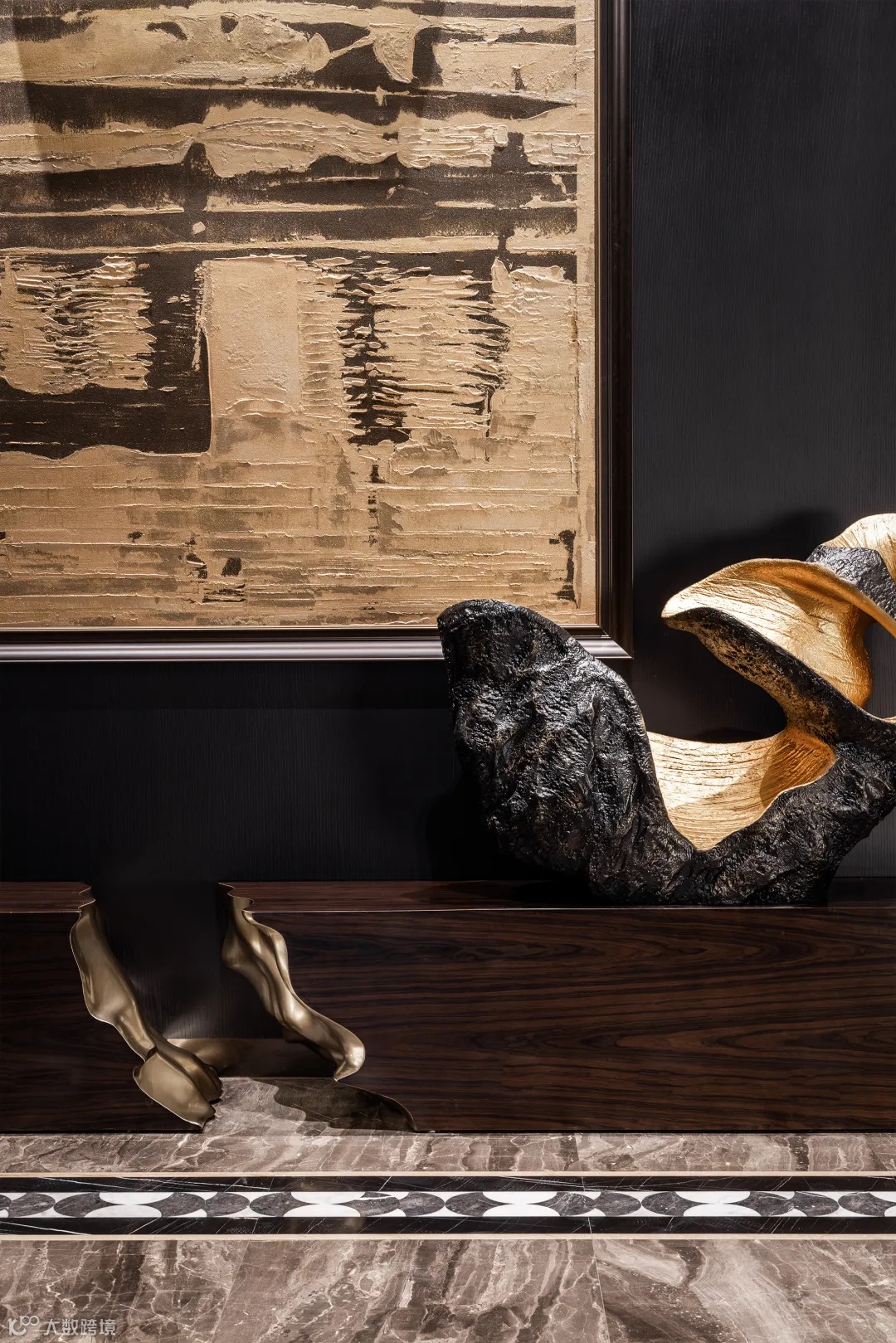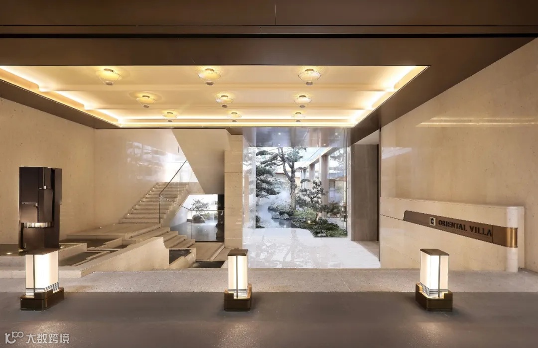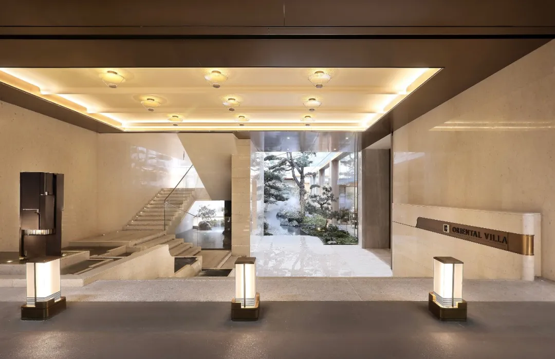 沐云川这次的追随步伐近到邻国日本,远到欧美。像从京都足立美术馆借鉴到,并最终内化成有着庭园风光般恬静的归家序厅;还有就是沿着“大水院”的下沉式行政酒廊;再到室内精装延伸出的侘寂风。