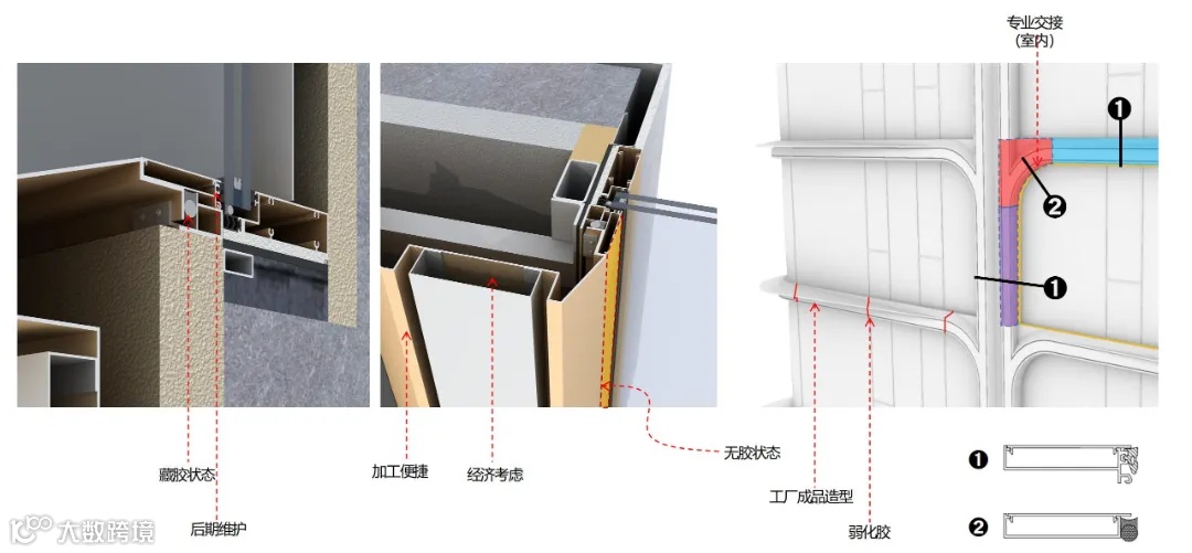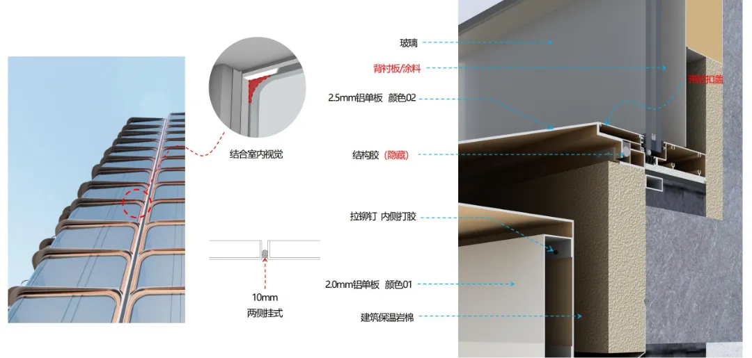 门窗系统采用组合窗类幕墙系统,更有效的呈现公建化住宅的现代感,更多的细节设计体现了幕墙的细节之美,通过扣盖藏胶;工厂单元板的使用;同色胶运用,使立面更具整体性。