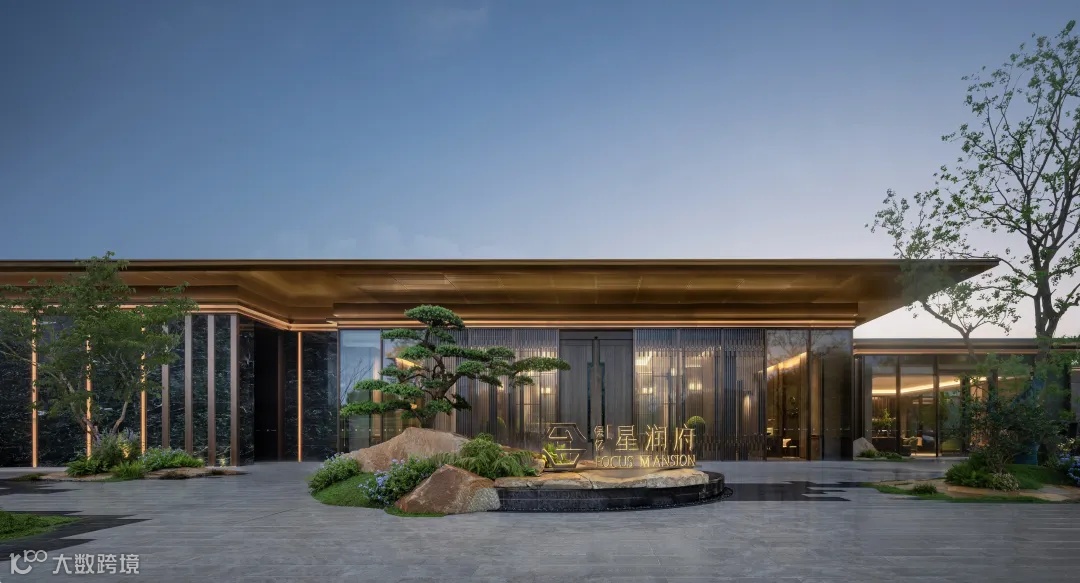 本项目的设计由新中式风格的入口、新中式合院、现代感高层组合,是中式建筑与现代建筑的对话及融合有机体。