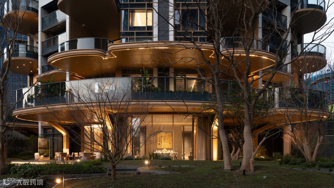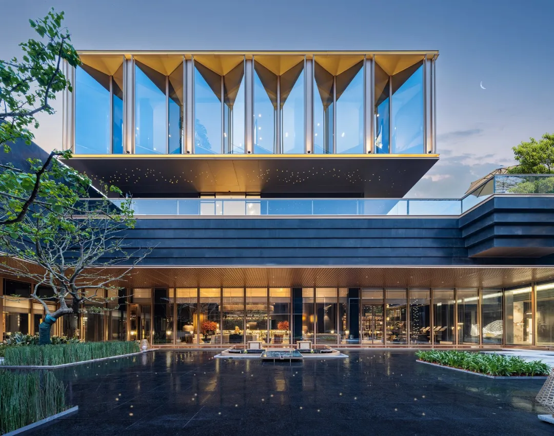 入口门头隐于自然之后,在传统礼序的基础上,融入了酒店式落客理念。弧形入口连接延伸落客平台,叠水景观拾级而上,华灯初上,四时皆景伴水归家。