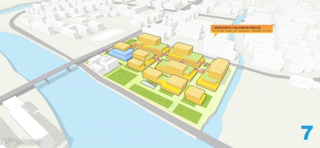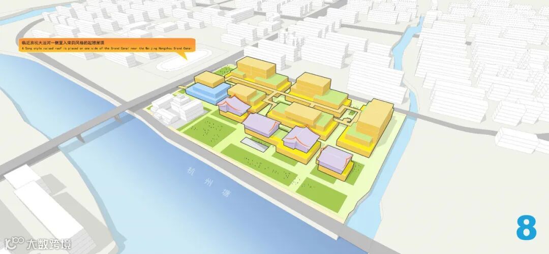 因此,我们在城市天际线的塑造上巧妙构思,向大运河方向建筑层数递减,北侧部分做到四层,南侧沿运河一侧体量减为两层,因地制宜,打造层层退台空间。不仅形成了向北逐渐抬升的建筑形态,还极大地丰富了天际线的层次感,使得从运河起点由南向北望去,整个城市景观呈现出一种优雅而有序的递升态势。
