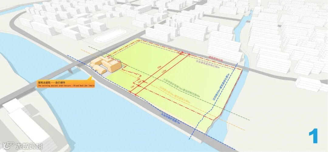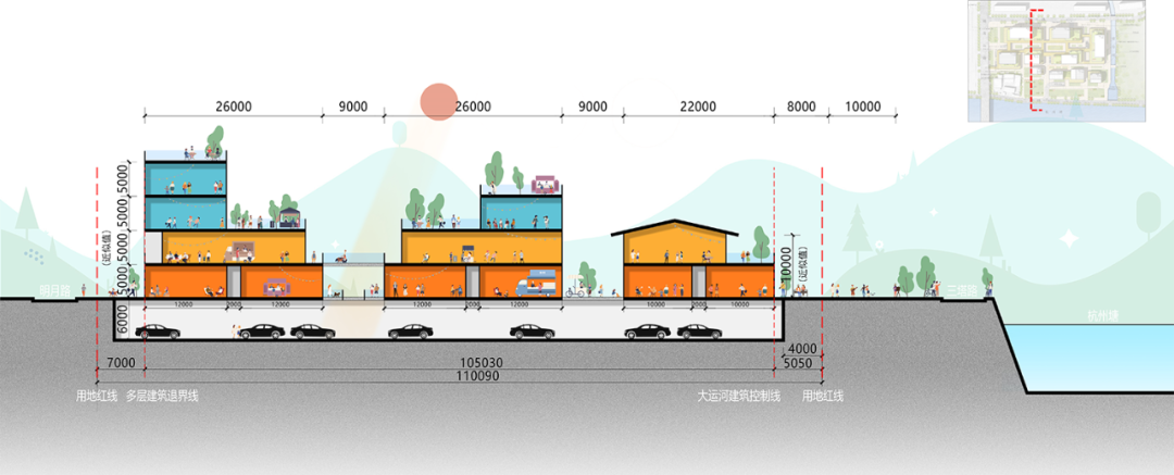 对于三益设计团队而言,大运河构成了本项目最为关键的机遇与挑战所在。鉴于项目南侧紧依杭州塘,作为大运河文化长廊的关键构成部分,并且位于三塔-壕股塔-烟雨楼视觉通廊之内,我们的设计工作必须严格遵循一系列大运河保护法规所规定的退线距离及建筑高度限制。