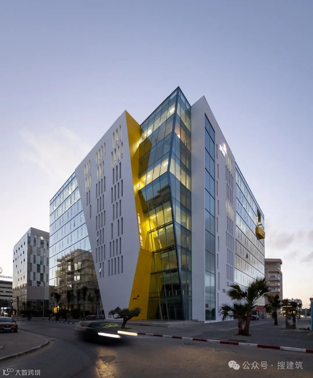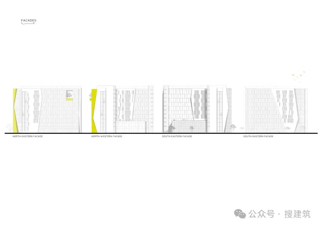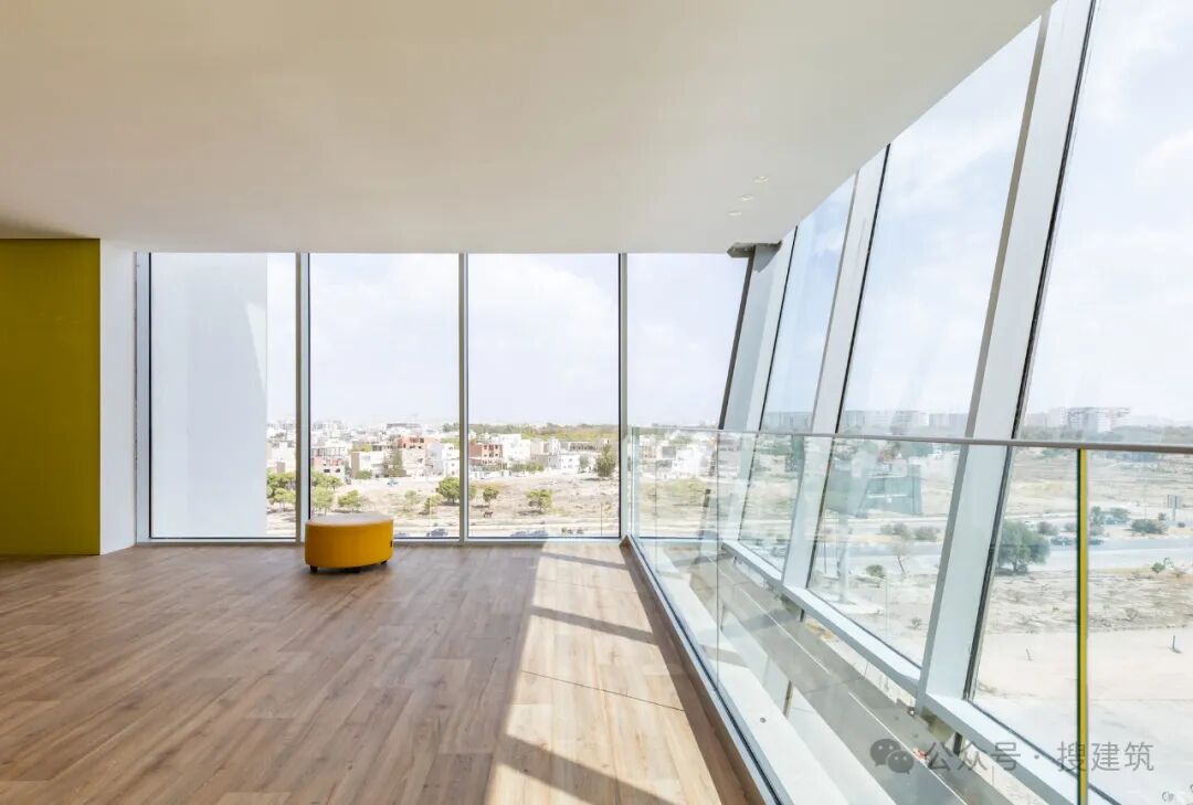从美学角度看,这座建筑经过了精心雕琢。主入口处有一个气势恢宏的玻璃结构,后面是双层倾斜的钢筋混凝土墙,墙面采用荧光黄 HPL 面板。这种色调在当地建筑中很少使用,但却赋予了该项目独特而刺激的个性。在黄色荧光板的覆盖下,一个独特的结构元素以悬臂的形式从主立面伸出,里面种着一棵橄榄树,向突尼斯的农业遗产致敬,并为整个建筑增添了一抹绿色。