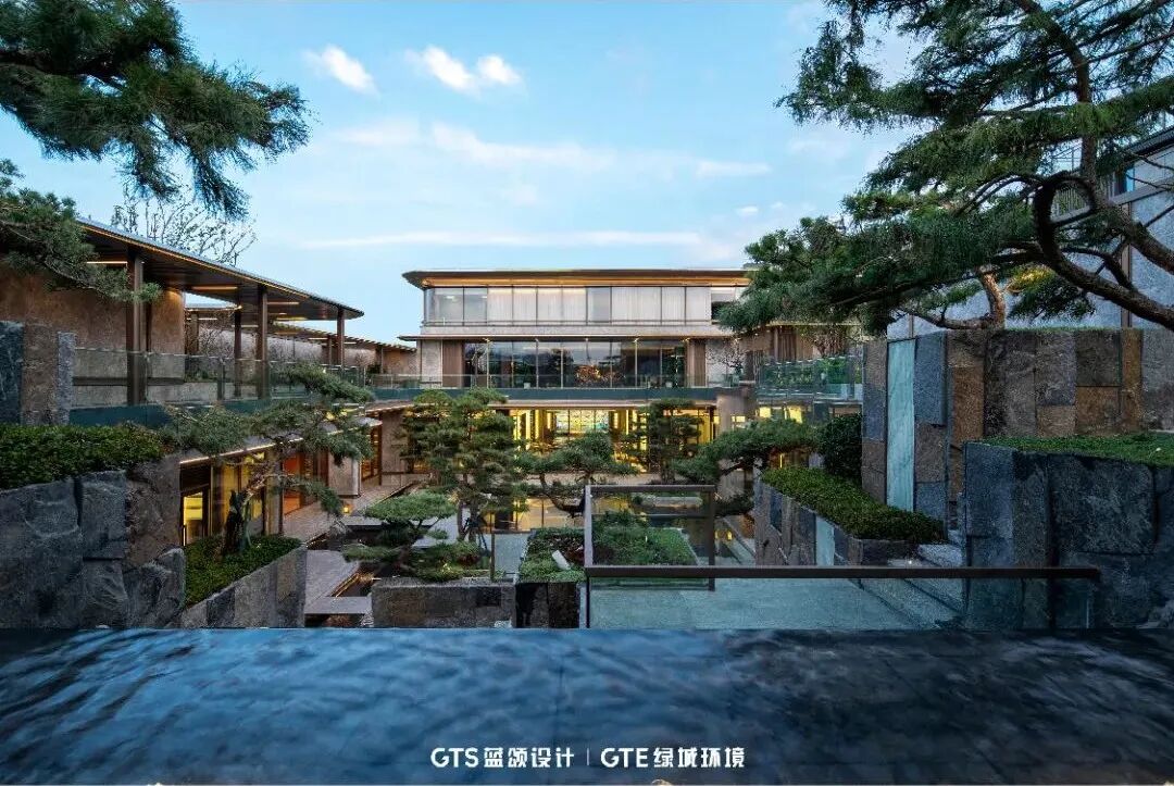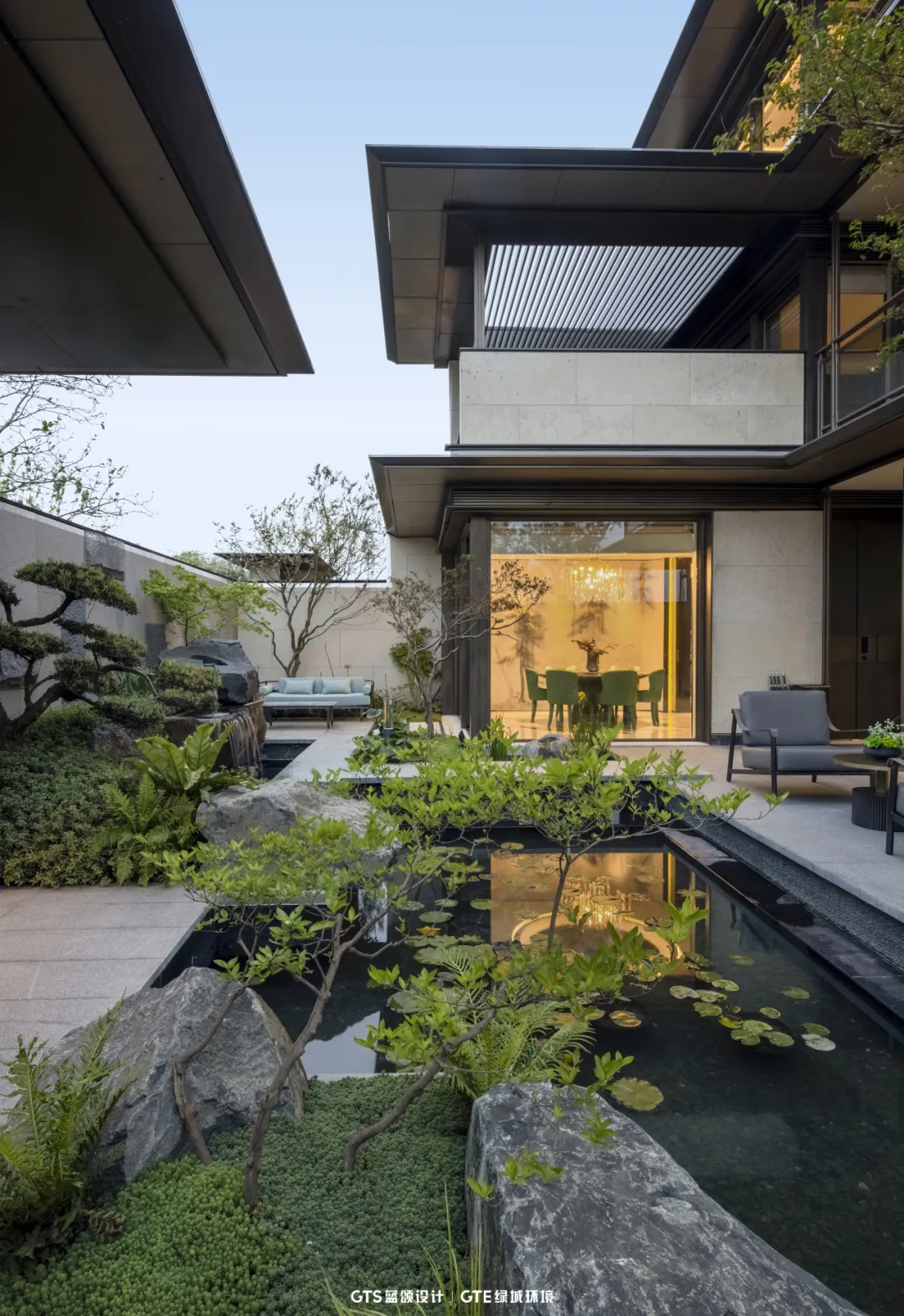 层叠水景托举折桥园路,松壑悬亭,石材点缀于水院中,雕琢出层层山峦肌理。室内与景观相互渗透,流光溢彩演绎当代宋韵山水的宁静与浪漫。