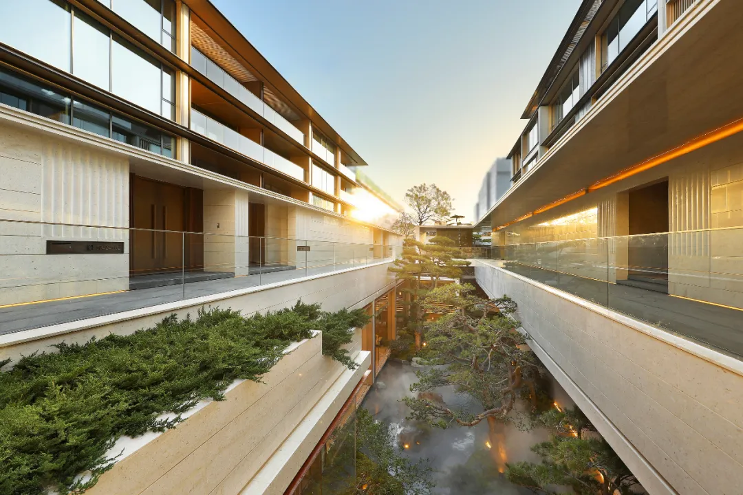 沐云川这次的追随步伐近到邻国日本,远到欧美。像从京都足立美术馆借鉴到,并最终内化成有着庭园风光般恬静的归家序厅;还有就是沿着“大水院”的下沉式行政酒廊;再到室内精装延伸出的侘寂风。