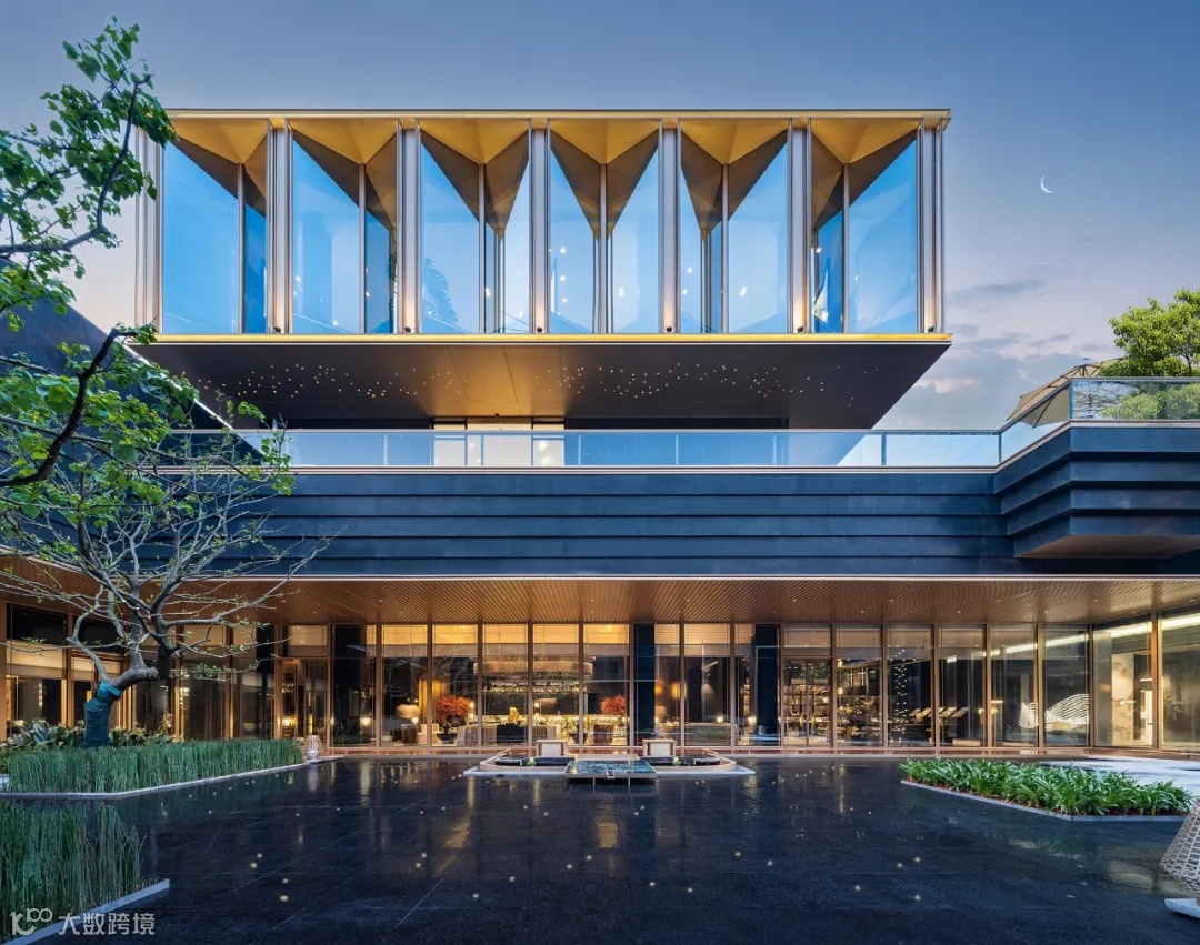 入口门头隐于自然之后,在传统礼序的基础上,融入了酒店式落客理念。弧形入口连接延伸落客平台,叠水景观拾级而上,华灯初上,四时皆景伴水归家。