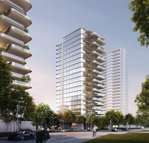项目高层建筑立面汲取凤翎元素,以大面积玻璃幕墙搭配银色和香槟色铝板,超高窗墙比、弧形圆角和转角无柱设计(部分),展现出“无界美学”。