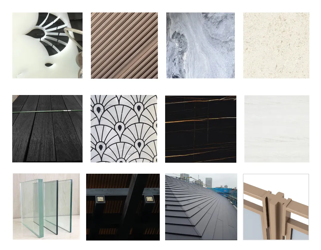 对于新中式东西入口的材料选择,主要使用了菠萝格木、透光石、瑾瑧年华、劳伦黑金、夹丝玻璃、仿铜不锈钢、高透玻璃、葡萄牙米黄、朱炳仁定制铜雕、金属屋面、铝合金、花岗岩、成品装饰柱....TAM配合业主及方案院选择、设计、落地呈现。