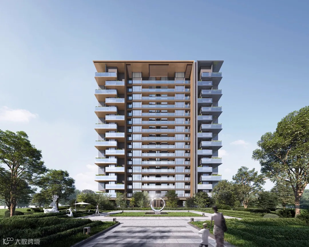 立面汲取“云”的灵感,颠覆传统住宅立面的平铺直叙,结合大面玻璃与铝板等材质的变化加强建筑的韵律感。