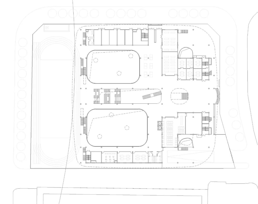解决方案。既然学生下楼不方便,能不能将户外空间带到各楼层上去?于是在我们的设计中,在每一层的中心位置都出现了一个本质上是露天房间的区域:这个空间有上层的楼板为屋顶,但没有墙体的围合。它像一个风雨操场,同学们可以在任何天气状况下,在这里锻炼、活动、玩耍;它还是一个开放的教室,老师们可以在这里授课、演示,同学们也可以在此自习、讨论。