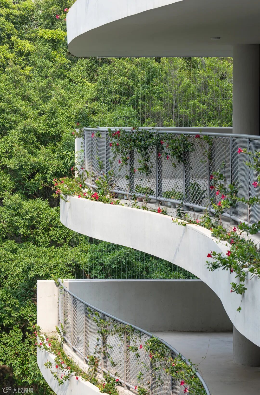 由于用地的局限,我们也意识到有必要把绿化引到建筑立面上,于是用钢丝网作为每层开敞空间的栏杆扶手材料,便于藤本植物攀爬。
