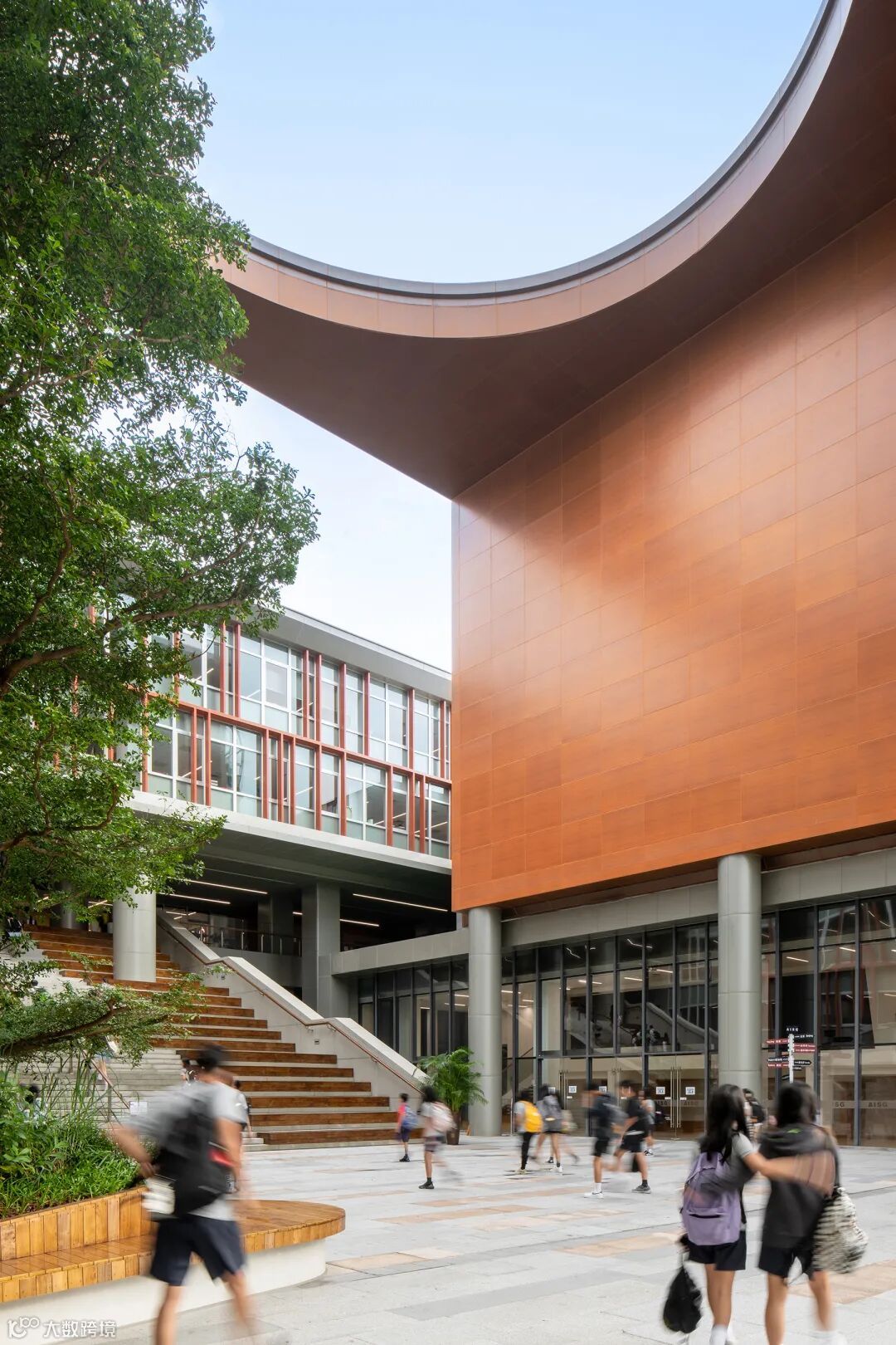 校园场地被自然荔枝林和山体环绕,通过减少建筑内走道以及优化各空间内窗户的数量和尺度,全新的建筑内外流线确保了充足的自然采光和通风,让学生拥有触目可及的绿色视野。