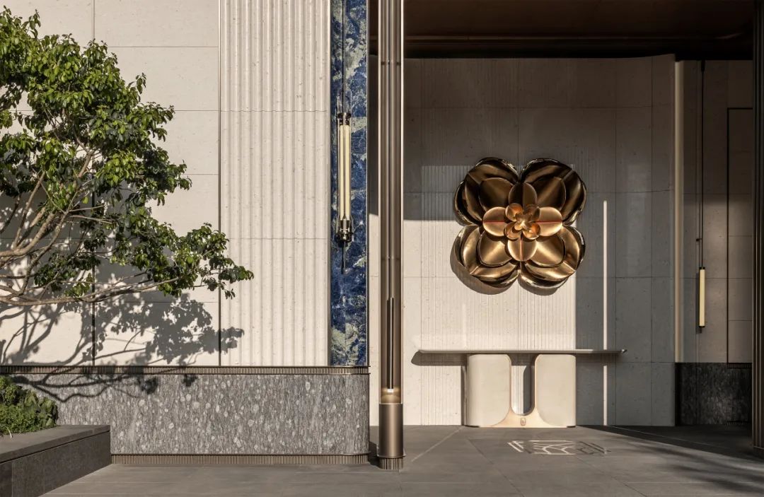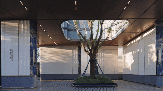 设计师巧妙汲取了香樟花园的灵感,招商臻境门庭入口处香樟破顶而出,是自然与都市的互融共生,是归家心绪的符号转场,作为对都市原乡理念的创新诠释,是空间的点睛之笔。自然元素穿透建筑的拱形立面,实现了生态与构造的和谐共生,为居住者提供了与自然对话的沉浸式体验。