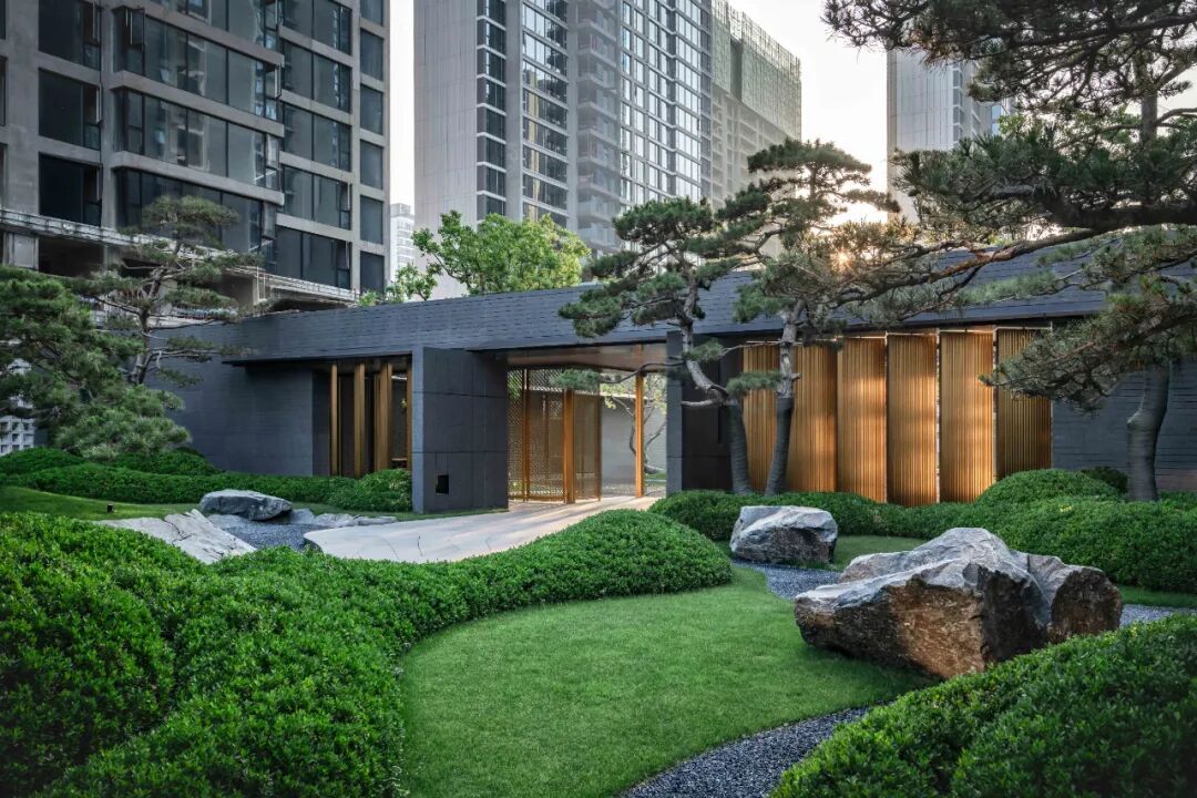 大门两侧的消防门蕴含中国人的含蓄之美,先见景后见门,入口与景观融为一体。门前的古松、山石、草坪犹如一块屏风,若隐若现。