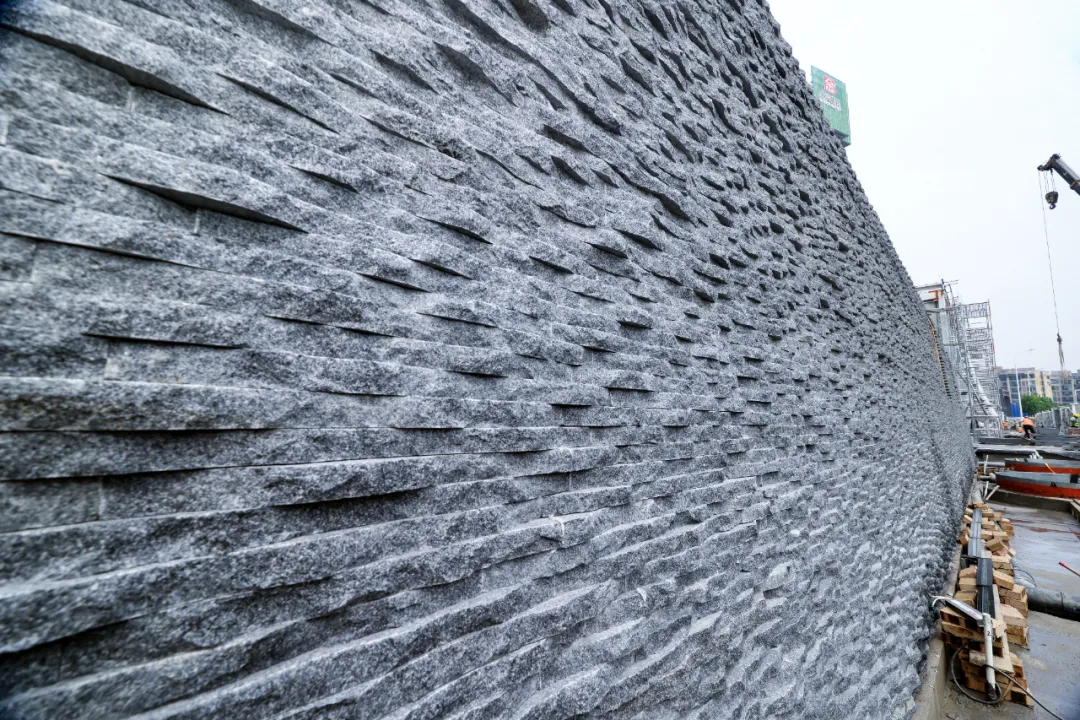 其实公区装修,最难的部分就是连纹砖对纹。大家仔细看左边的墙面,全都是带纹路的,工人铺贴每一块瓷砖的时候,那都是严格按照编号施工的。