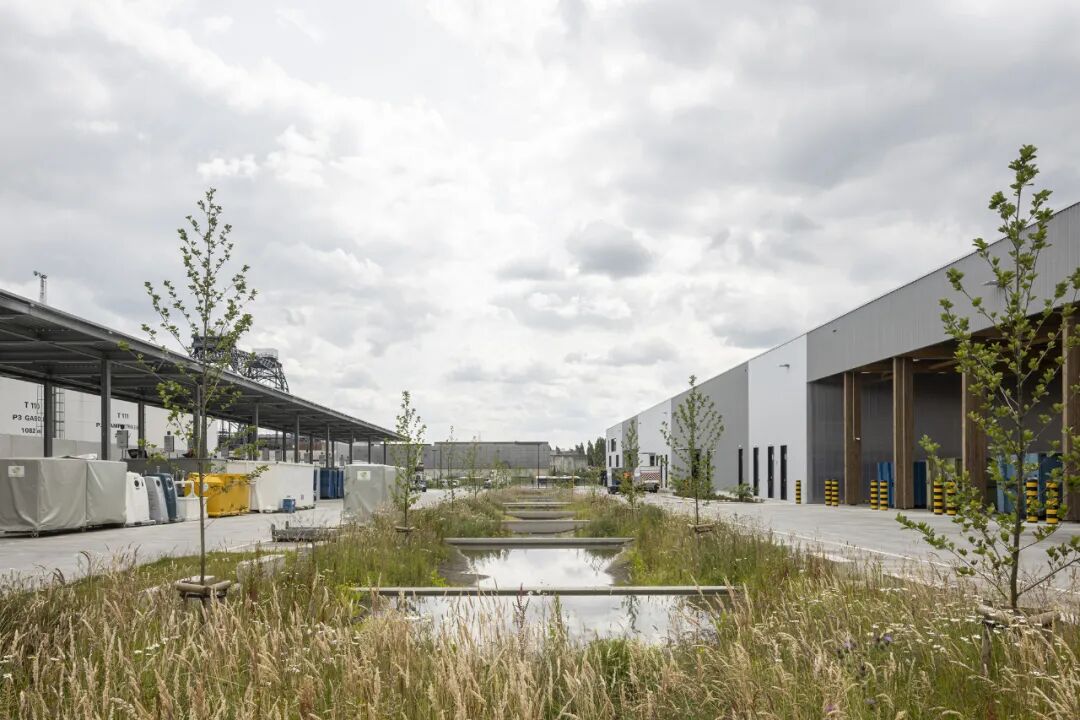 In this project, preference was given to local and renewable materials, respecting the principles of the circular economy. The choice of a wooden construction reduces the ecological footprint and ensures flexibility and adaptability in the future thanks to the modular design. The dry construction method used minimises disruption on site, optimises natural resources and facilitates dismantling and recycling at the end of its life. Short supply chains were chosen as much as possible throughout the project. For example, thousands of m3 of soil from earthworks were transported by sea via the canal and materials were transported by boat.